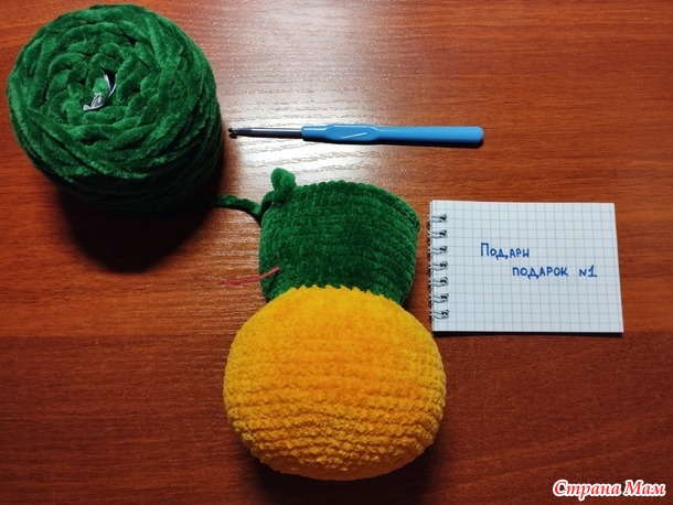 При вязании за основу брала бесплатный МК от Ирины Куренковой. У автора игрушка связана из более тонкой пряжи, поэтому мне пришлось переделывать под свой размер. Конфетку-леденец вязала из пряжи Джинс по МК из интернета из свободного доступа.