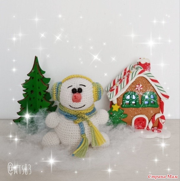 Связан крючком №1,5, пряжа из фикспрайса, кажется, называется Картопу Амигуруми. Довольно толстая. Без шляпы размер Снеговика 14 см. Шляпа связана из Детской новинки. Автор описания Анна Богомолова.