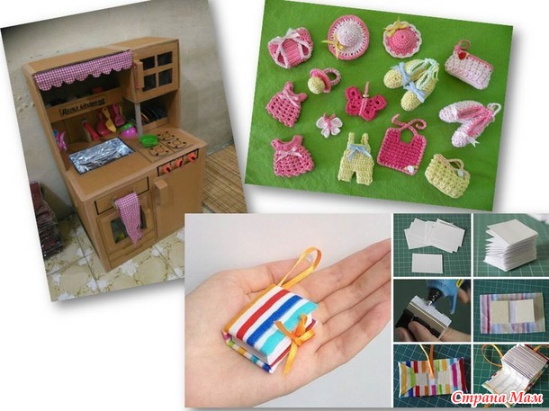 Бросовый материал, остатки различных материалов, вторая жизнь старых вещей. Это может быть как и игрушка, так и мебель и аксессуары для игрушек. Обратите внимание выше на фото, есть некоторые вещи именно из бросового материала)) Тут можно разгуляться не на шутку