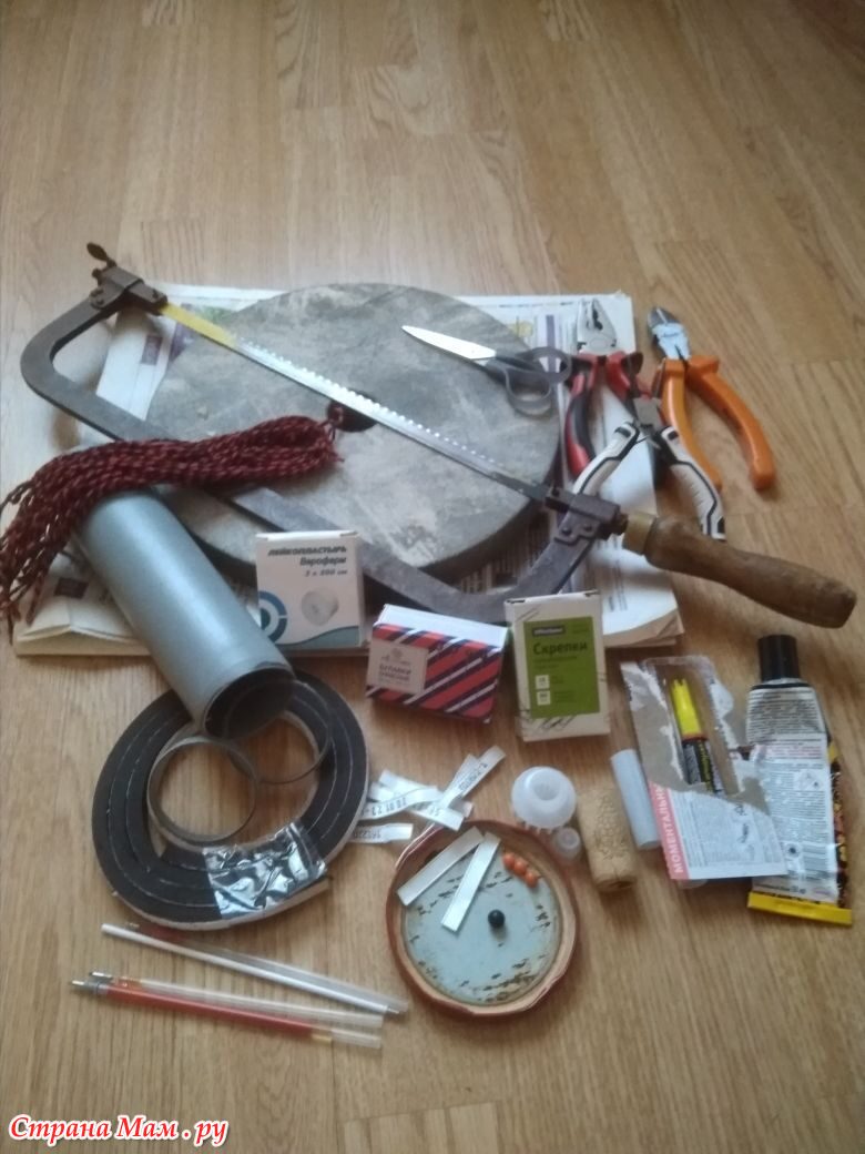 Собрала материалы – пустые стержни от ручек (можно от гелевых, они потолще). Из них я решила делать все «металлические» части рамы. Но не самые тонкие – не получится прикрепить колёса, порвались (испытано). У меня какие-то плотненькие, твёрдые, причём разноцветные (когда-то дети мои любили ручки интересные, а мать ... стержни не выбросила,это ж надо!) Кусок трубы ПВХ, точильный круг, ножовка, кусок резины от старой велосипедной камеры- это всё муж мой мне с барского плеча дал.Но когда я делала второй велосипед, я нашла материал для покрышек лучше – уплотнитель для дверей или окон (тоже в гараже у мужа нашёлся, мне отдал). Клей,кусачки, плоскогубцы,проволочки – зажимы от хлебных пакетов… И вообще, всякая фигня….