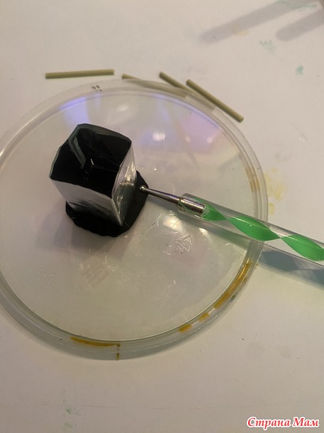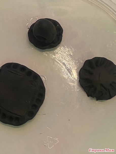 Из черной или даже другого цвета пластики делаю донышко и верхушку, состоящую из нескольких слоев, и навершия. Отделываю, сушу.