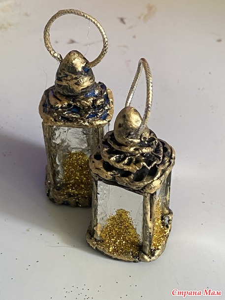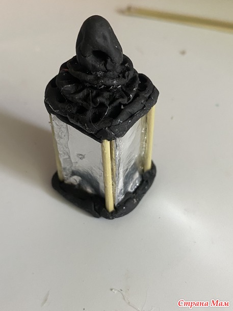 После сушки, собираем фонарик. На боковые грани приклеиваем кусочки соломинки. Клею я титаном намертво. Красим в черный цвет, сушим. Потом полусухой кисточкой делаем золочение. Потом вдеваем шнур, стык склеиваем титаном и аккуратно засовываем внутрь навершия. Получается похоже на металлическое кольцо.