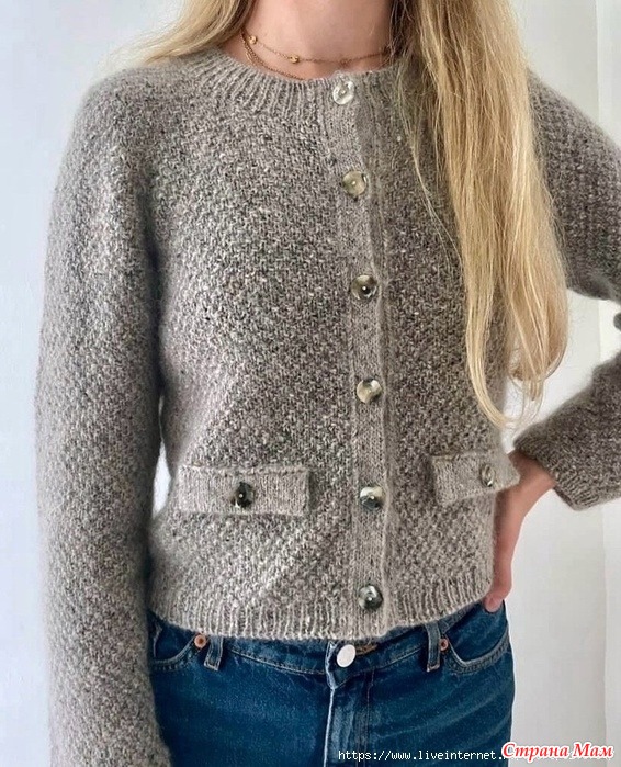 Жакет Manon вяжется узором «мох» поворотными рядами сверху вниз.