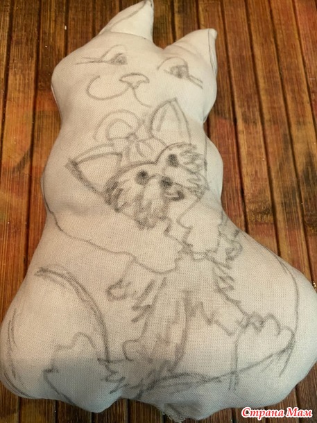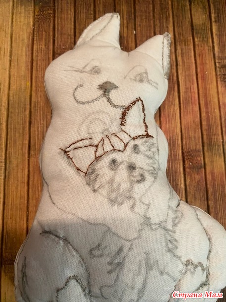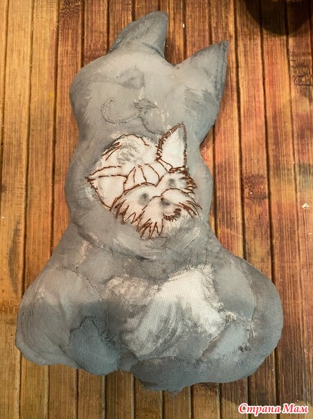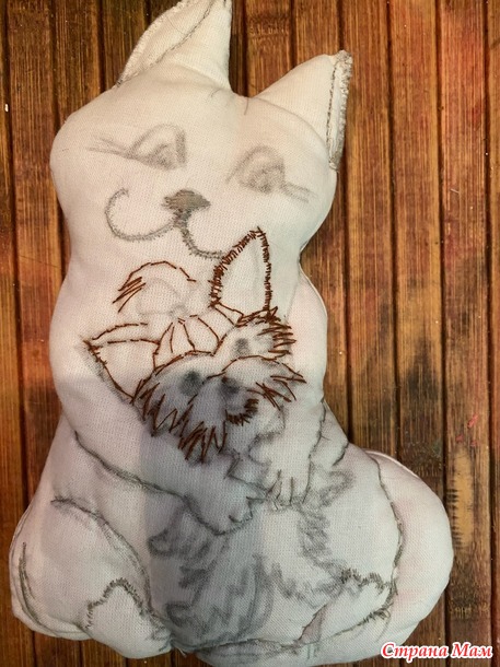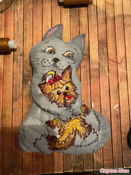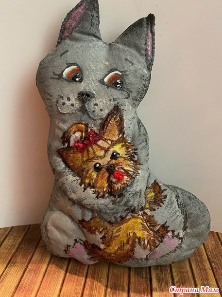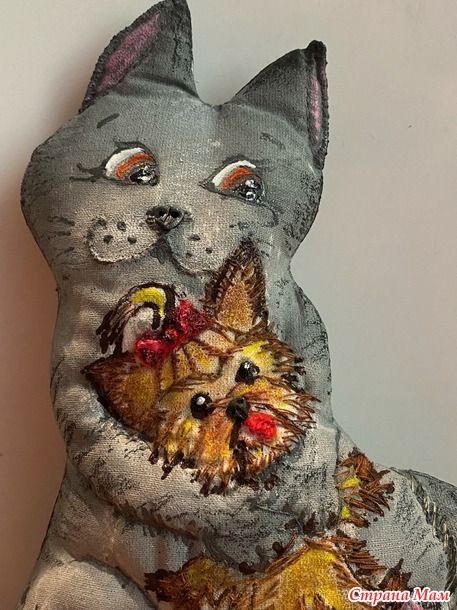 Эту работу в стиле грунтованный текстиль с вышивкой делала года три назад для конкурса. И в память трогательных отношений наших животных, которые теперь оба уже в лучшем мире. А началось с того, что сын подарил мне крошечного щенка Йорка. Я всегда жила с собаками, собачник в душе, я тащила с детства найденных щенков домой. Каких- то родители оставляли, каких- то пристраивали по родственникам, друзьям и просто добрым людям. Но все мои собаки были достаточно крупными, а тут такая кроха! Ситуация осложнялась еще и тем, что за четыре года до этого муж принес домой котенка. Он больше кошатник, и друзья подарили ему породистого котенка перса-шиншиллу, который за четыре года превратился в огромного мегапушистого котяру. Я очень переживала, как сложатся отношения огромного кота и крошечного песика. Но мои опасения оказались напрасными. Правда, сначала пару дней кот смотрел на щенка с недоумением, потом переводил взгляд своих оранжевых глаз на меня, словно спрашивая: «мам, а что поприличнее ничего не было?» Щенок же трясся, но рычал, прижимаясь к моим ногам. И вот день на третий Гаврик(кот) серой тенью обернулся вокруг трясущего создания, и начал вылизывать его мордочку. Это при том, что Гаврик был жуткий лентяй, и себя никогда не вылизывал, оставляя заботы о чистоте своей шикарной шерсти мне. А вот за малышом установил контроль и заботу. И защиту! Никого чужих и близко не подпускал к щенку. В мгновение ока, при подозрении, что сыночку грозит опасность Гаврик из ленивого добряка превращался в разъяренное шарообразное существо, шипящее и орущее диким голосом. Так и воспитал нашего Зума. И частенько Гаврик присаживался на свой объемный зад и обнимал Зума, укладывавшегося на мягкий теплый меховой живот кота. Так обнявшись часто и засыпали.