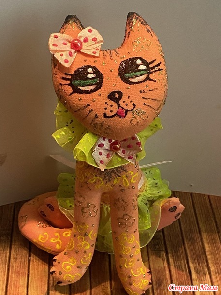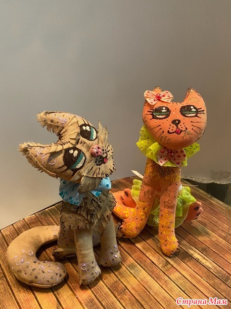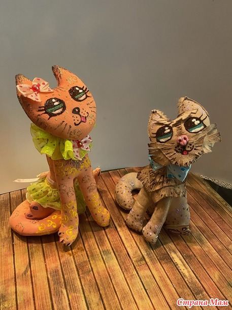 Это тоже грунтованные кошки. Она - вся такая гламурная, романтичная, крашена раствором свекольного и морковного сока. И на фото это не очень видно, но по всей кошечке есть роспись акриловым контуром с золотыми блестками. В общем, настоящая барышня! Он же простой дворовый котик, увидевший такую красоту и обомлевший. Тонирован раствором кофе. От этих игрушек остались только пять фото, но процесс изготовления аналогичный влюбленной парочке, которую я ранее выставляла. А эти котики живут теперь о-очень далеко!
