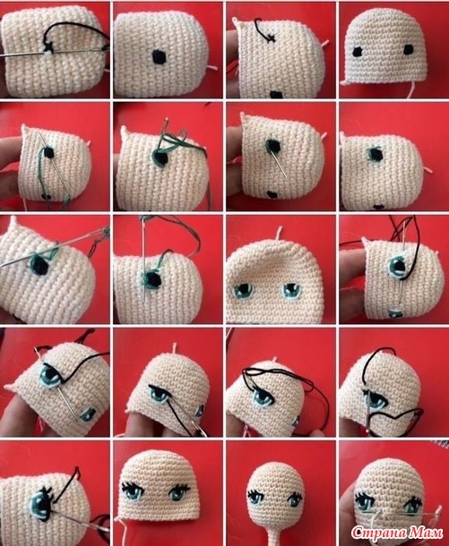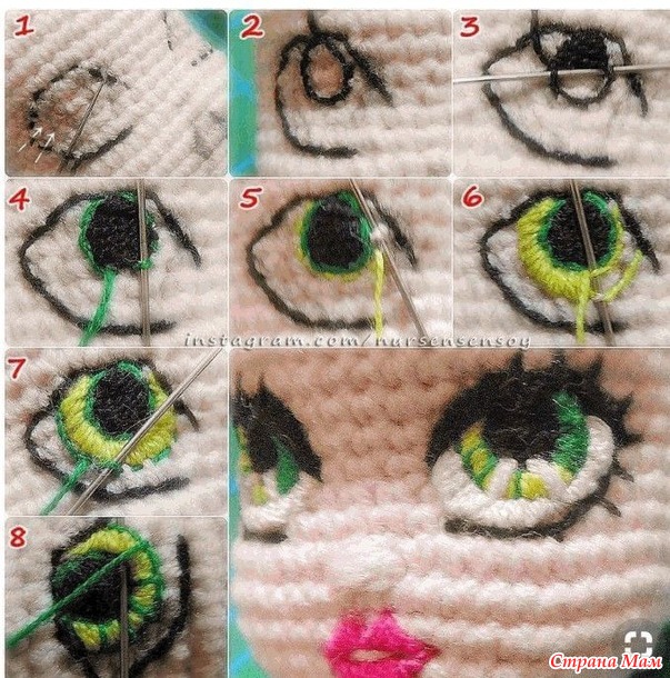 Ввести иглу в затылок, вывести в верхнюю часть глаза, затем вколоть в нижнюю часть глаза, при этом петлю нити спрятать под глазом, вывести иглу в нижнюю часть второго глаза, слегка подтянуть, вколоть в верхнюю часть глаза, нить спрятать под глазом, вывести иглу в верхней части другого глаза, слегка подтянуть. Повторить утяжку еще раз, но утягиваем не сильно, только слегка обозначить утяжку. Конец вывести туда, где начинали, завязать кончики на узелок, нити спрятать внутри головы.