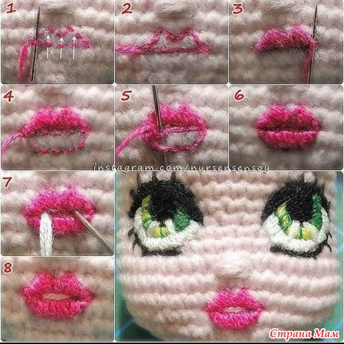Прокладываем один стежок, его обвиваем нитью. Зтем прокладываем второй стежок, его также обвиваем нитью. Затем выводим иглу внутри с одного края губ, вводим на одну петлю дальше, чем стежки для губ, затем выводим внутри губ с другого края и вводим на одну петлю дальше стежков для губ. Внутри губ сделать пару стежков белой нитью на трех петлях.