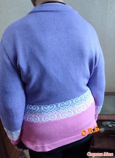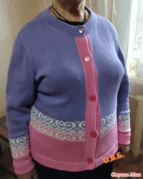 Понизу изделия двойная планка кулирной гладью. Переплетение: кулирная гладь, однофантурный жаккард по перфокарте. Планка для пуговиц и обтачка горловины - ложная кетлевка в карман.