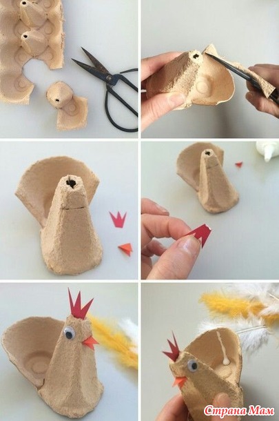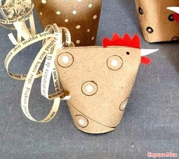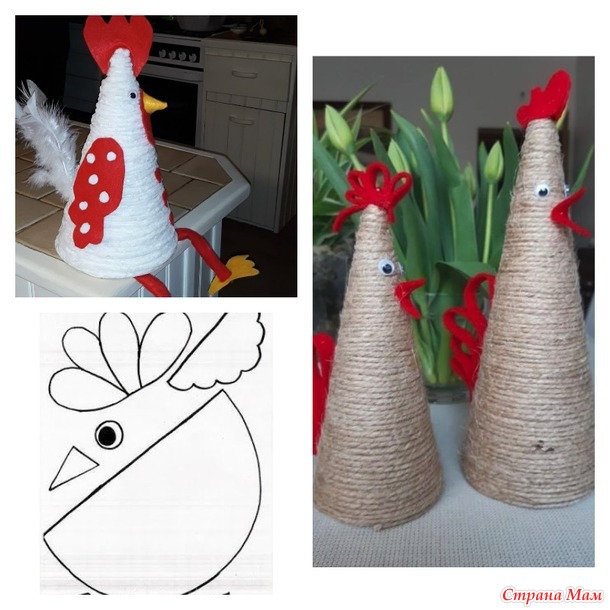 Конус из плотной бумаги, остатки пряжи или джутовая бечевка, цветная бумага или кусочки фетра и вуаля - готовы петушки и курочки: