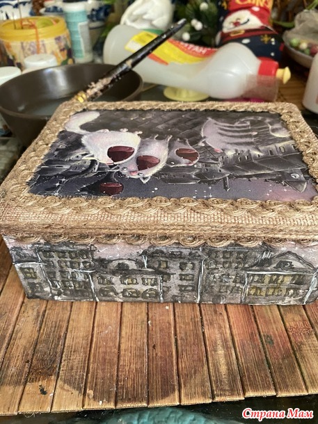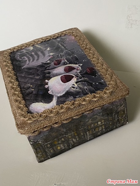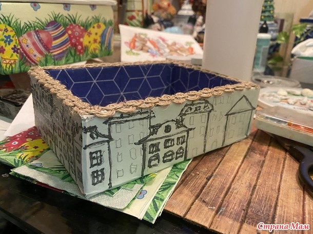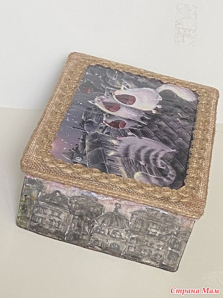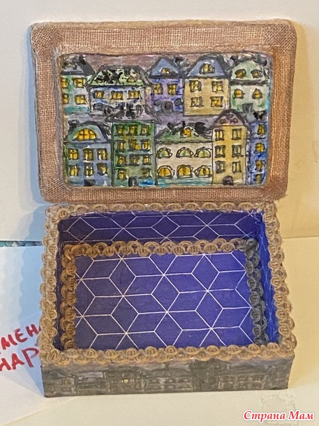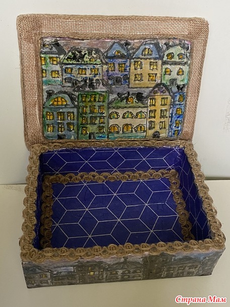 Поэтому просто крышку снизу нарастила в центре, создав. Скую площадочку, чтобы крышка плотно сидела на шкатулке. И на этой площадочке тоже сделала декор. На боковых стенках нарисовала или любимые домики. Чтобы сюжет их гармонировал с картинкой кюна крышке. На крышку катртинку наклеила, предварительно ее истончив, и задекорировала джутовым полотном( края) и отделала широким фигурным джутовым шнуром. Внутри наклеила подходящую салфетку с геометрическим узором. Намаялась! Но результат понравился. Тоже отделала джутовым шнуром.