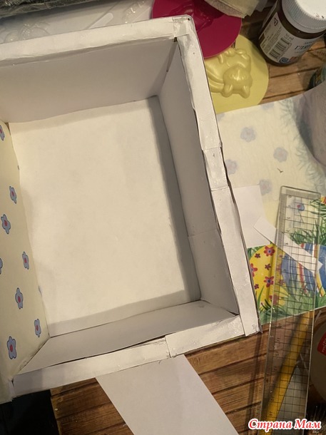 Поэтапно я наращивала стенки, укрепляла и выравнивала уголки при помощи картона и малярного скотча, утолщала дно, формировала крышку. Решила делать простую шкатулку без креплений, со снимающейся крышкой. На картон, даже многослойный и укрепленный крепеж приделывать еще то удовольствие!