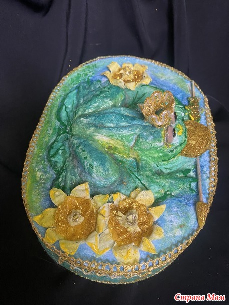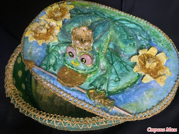 Делаем окантовку крышки тоже из золотой тесьмы. Приклеиваем стрелу, основу для кувшинок. Потом на эту основу делаем объемные лепестки из ватных дисков и тычинки. Дальше декорируем глиттером золотым. Делаем монетку из картона и тоже посыпаем щедро глиттером. Лягушку покрываем таким жидким гелем специальным, чтобы она выглядела влажной. Добавляем ей бородавок для правдоподобия.