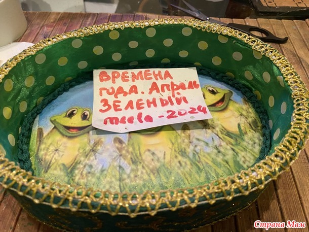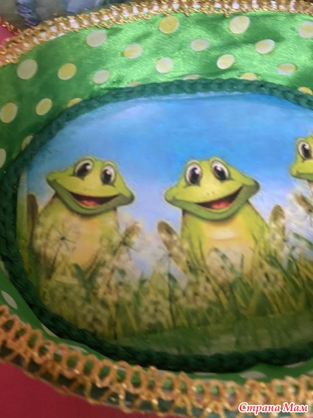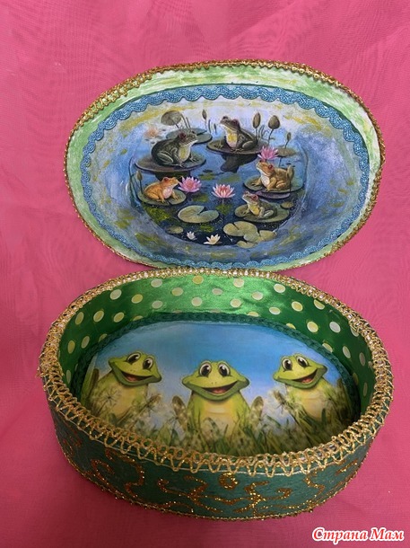 На крышку помещаем распечатку с лягушками. Немного подкрашиваем акриловыми красками.на дно приклеиваем еще одну распечатку, и как вы уже догадались, тоже с лягушками! А боковинки изнутри оклеиваем атласной лентой подходящей ширины.
