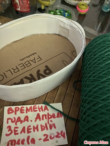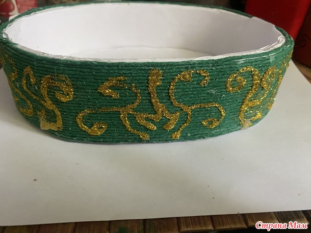Наружные боковины отделала хлопковым шнуром зеленого цвета. Аккуратно намотав его на клей ПВА.