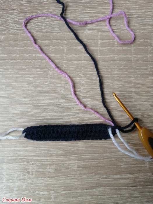 Провязываю 21 столбик без накида (последний, 21 столбик, тоже отмечаю маркером). разворачиваю цепочку и провязываю 21 столбик без накида по второй стороне цепочки.