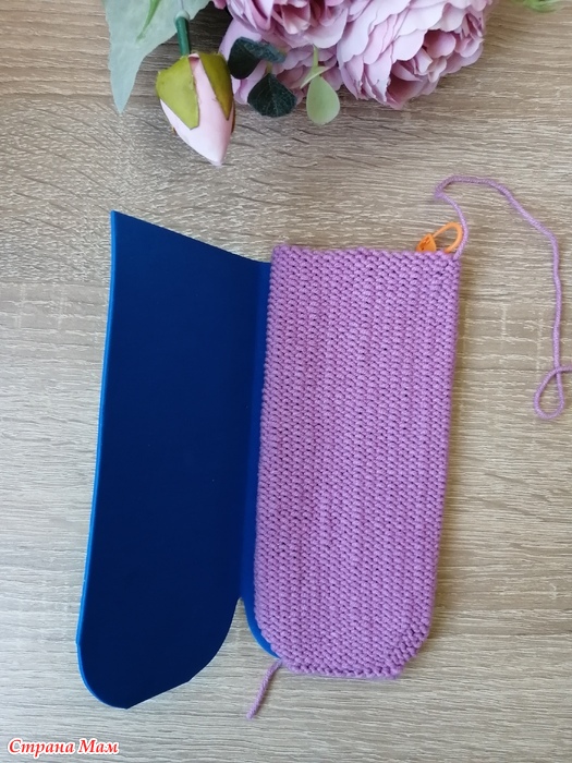 Чехол выворачиваем наизнанку, вставляем внутрь заготовки фоамирана и с помощью длинной линейки пытаемся его вместе с фоамираном поместить внутрь нашей основной детали.