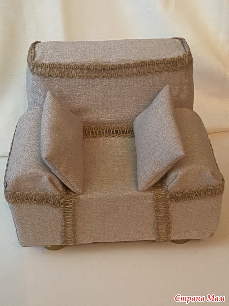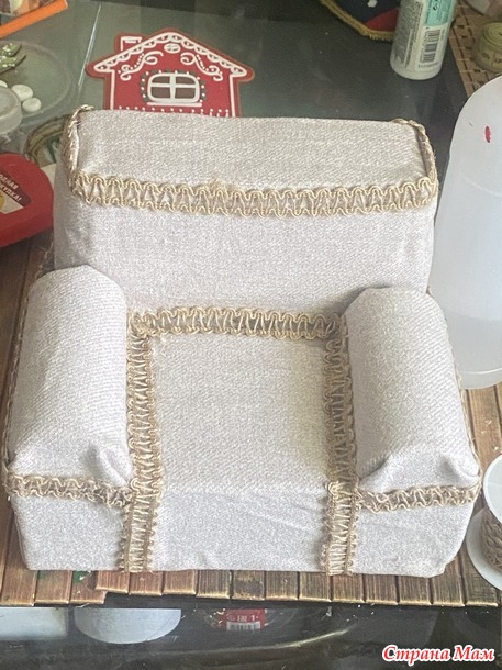 И наконец, я его обтянула мебельной тканью. Стыки и неровности закрыла любимой джутовой тесьмой, которая подошла как раз по цвету.