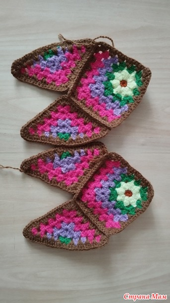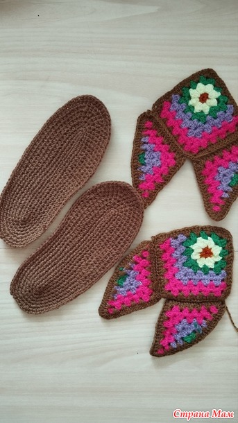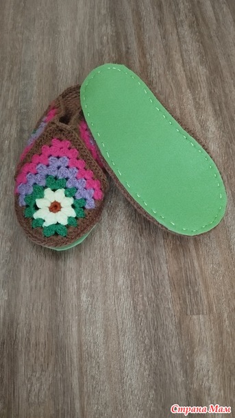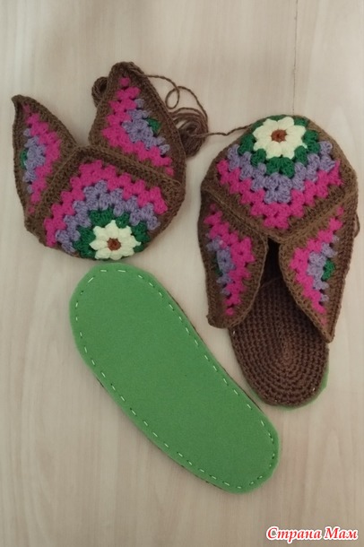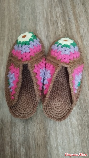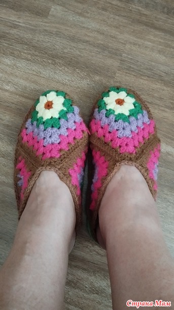 Наконец - то я закончила свой долговяз тапочек! Начала вязать мотивы зимой 2 года назад. Навязала на несколько тапок разными цветными ниточками. Но пришла весна с "полевыми работами", потом лето и времени на рукоделие не стало хватать. И остались все мотивы лежать и ждать счастливого случая, когда же я смогу вновь приняться за работу. Но ... пыл пропал ... Не знаю сколько бы еще они лежали, если бы не Довяжика! Игра мотивировала на завершение "проекта"