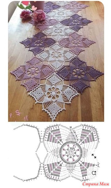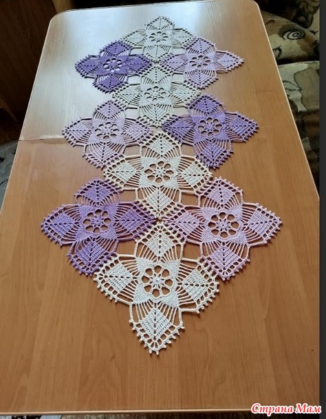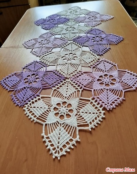 Увидела эту дорожку в инете и решила что она подходит для моей цели - избавляться от остатков. Правда думала, что она будет поменьше размером, но на мой стол она вписалась отлично. Нитки Ярнатр виолет, 280м/50гр, крючок №0,8, размер - 96х48.