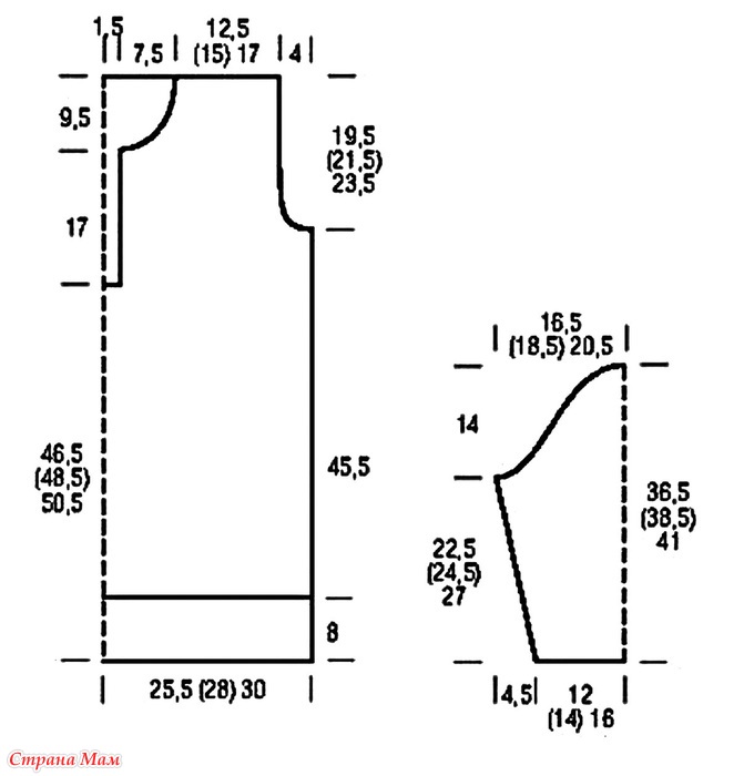 Для пройм через 45,5 см = 132 р. от нижней планки закрыть с обеих сторон 1 раз по 4 п. и в каждом 2-м р. 1 раз по 2 п. и 2 раза по 1 п. = 82 (90) 98 п.