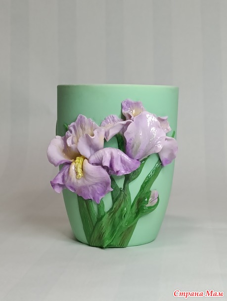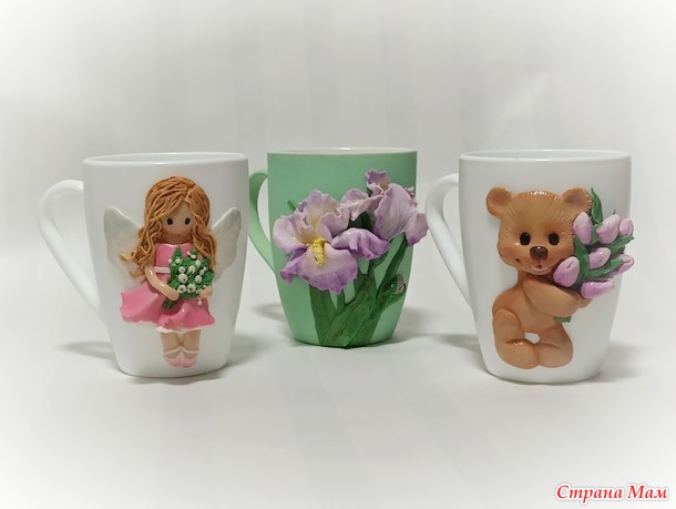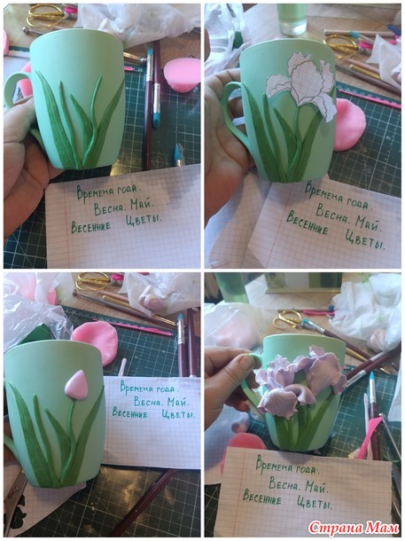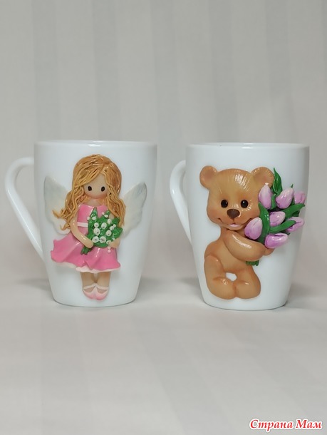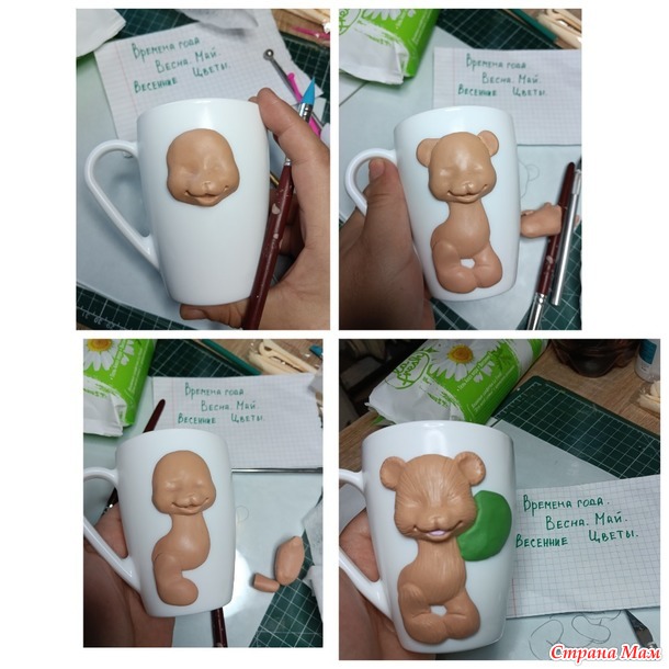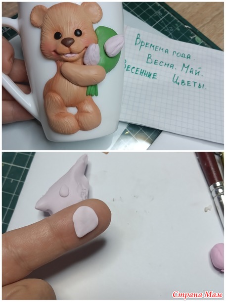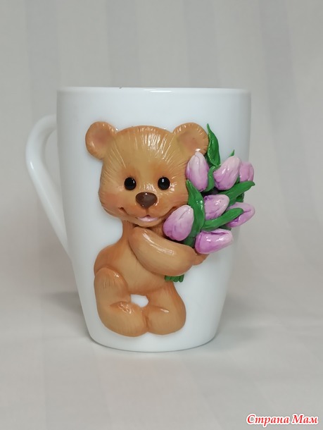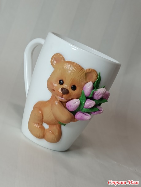 Процесс создания чашки с медвежонком, который держит тюльпаны. Использовала цветную запекаемую пластику.