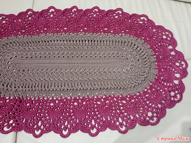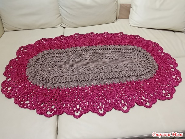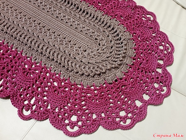 На основе ковра "Майское чудо", на который масса мастер-классов в интернете. Немного изменила узор. Убрала наиболее "шнурозатратные" ряды. Ниток было ограниченное количество, по мотку бежевого и бордового. Ушло всё. 1000 метров шнура толщиной 4мм. Крючок номер 7.