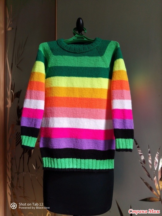 И так мне запало цветовое сочетание этих изделий, что время шло, а желание тоже сообразить воплощение не отпускало. Засада была в подборе пряжи. Там 10 цветов. И вот однажды захожу в наш Самовязов (мне повезло - интернет магазин по соседству) и вижу множество нужных расцветок! Решение было принято мгновенно. Набрала все, что помнила, потом докупила недостающие колеры. Но главные яркие цвета были! Удачно совпало, что других проектов на спицах не было, поэтому сразу взялась за дело. На девочку рост 134 набрала 96 петель на бросовую нить. Реглан от горловины получился таким, как хотелось. Ярким! Про такое говорят - глаз радует. Скоро отдам, а пока решила показать. Вдруг кому то понравится и такое воплощение.