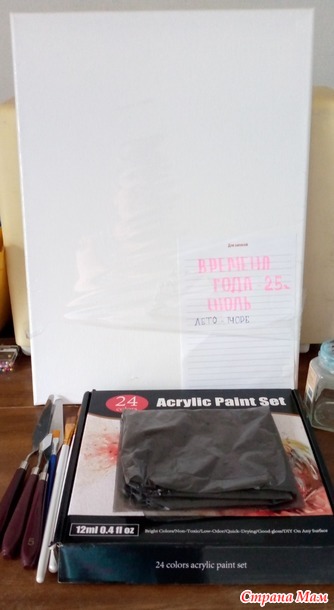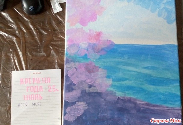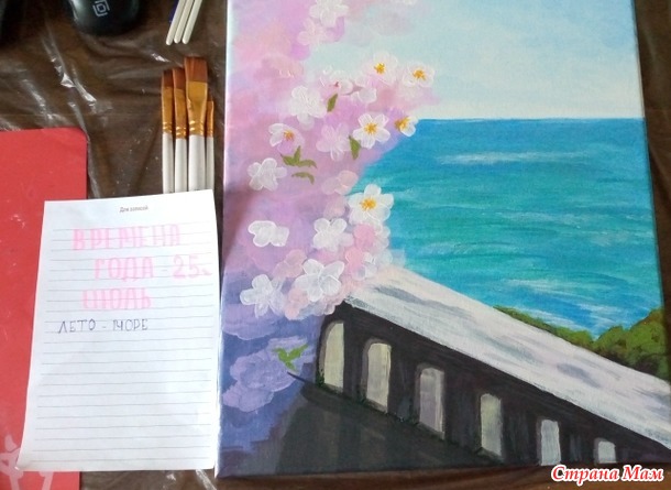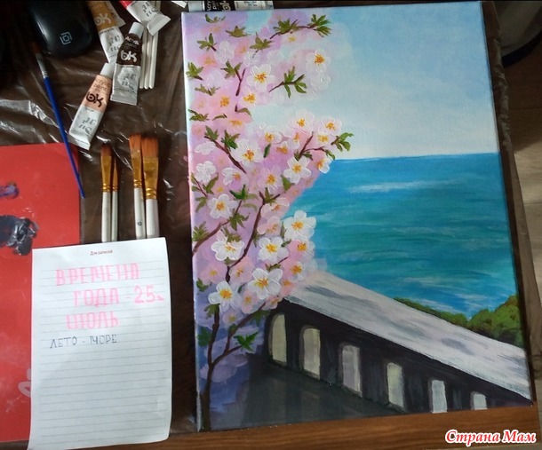 Мой второй отчёт за июль. Набережная. Мои материалы: холст, акриловые краски, кисти, мастихины.