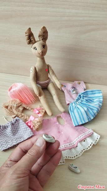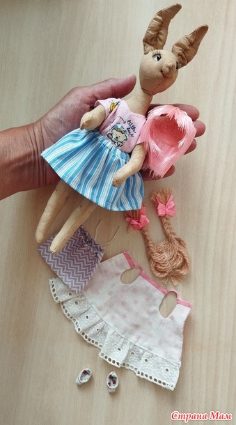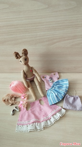 А потом мне пришла идея сделать заменяемые прически. И у Заи появились косички из пряжи с розовыми бантами и паричок из атласных лент двух близких по тону розовых цветов.