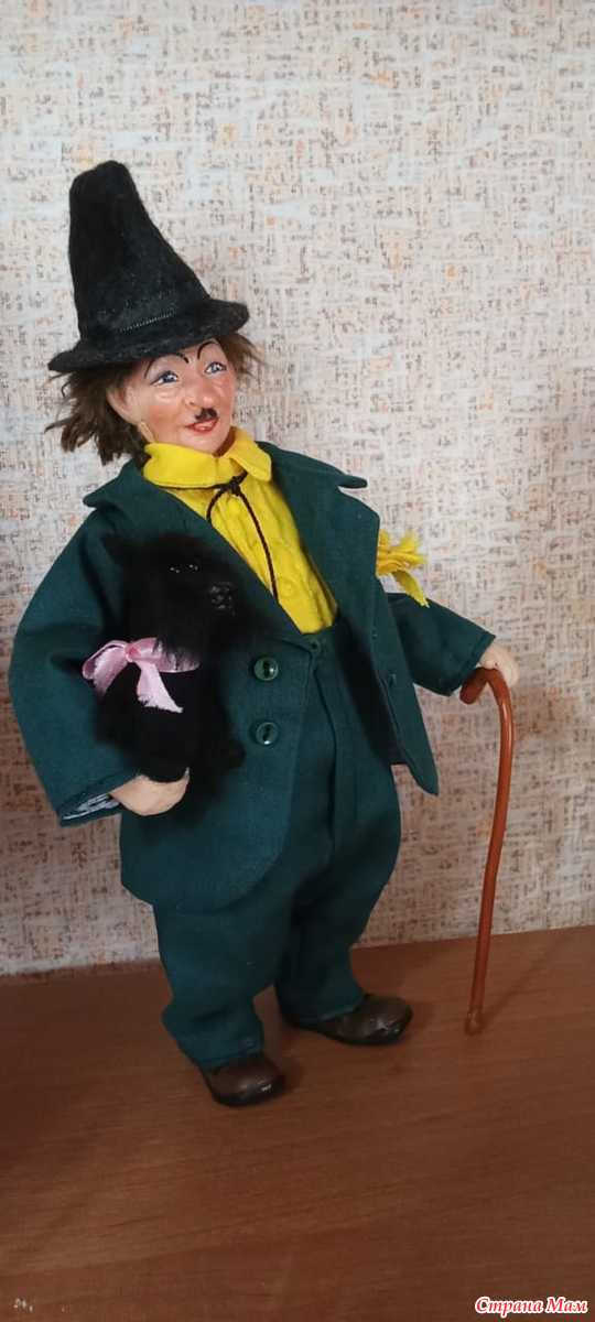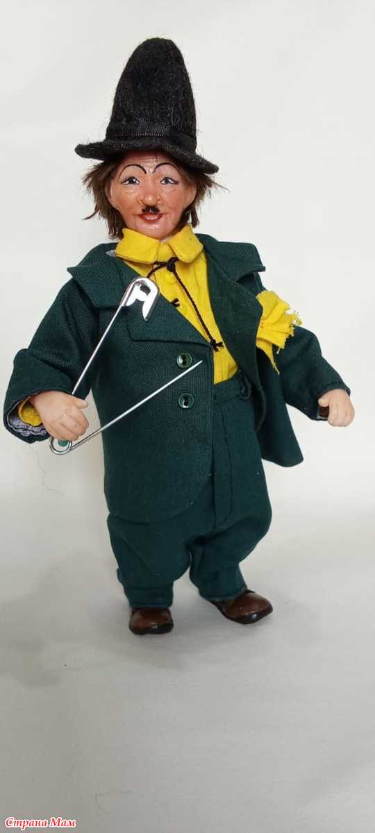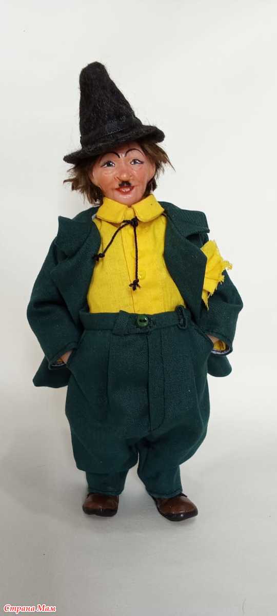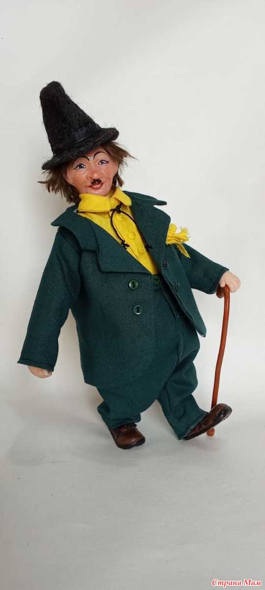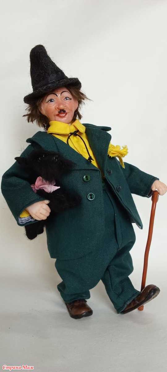 Ещё и тросточка есть у Карандаша.Начинал свою карьеру клоун Румянцев в образе, похожем на образ Чарли Чаплина. Но постепенно придумал свой, тоже узнаваемый с первого взгляда. Мужчины моей семьи сразу назвали правильное имя, взглянув на мою новую куклу. На портретное сходство не претендую (я ж не художник!) Для меня главное было создать узнаваемый образ.