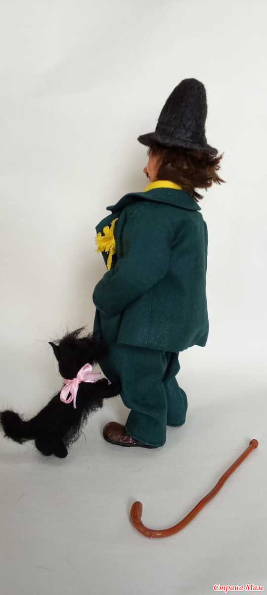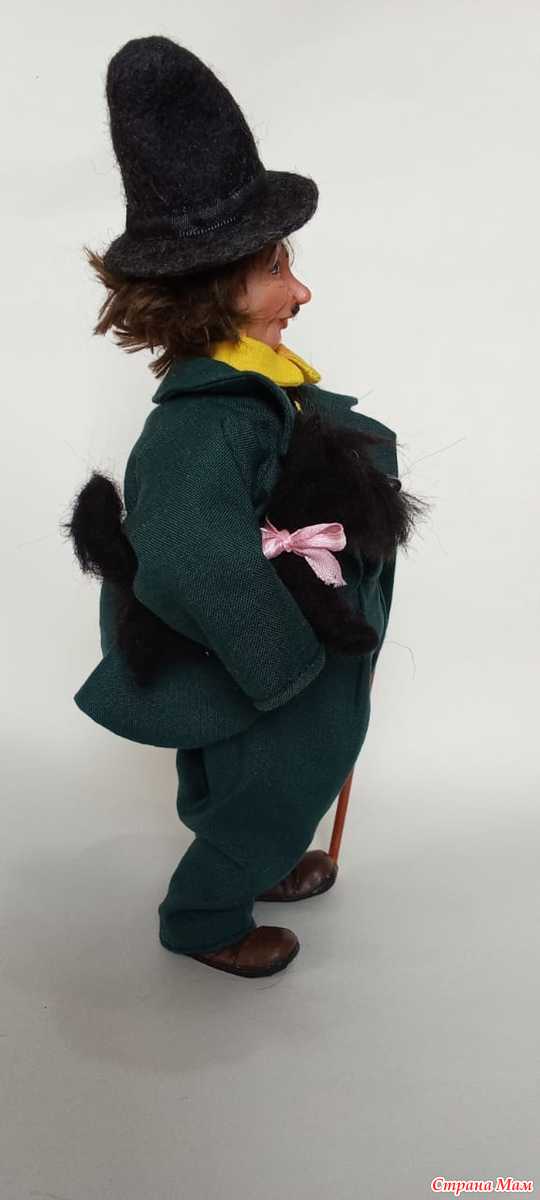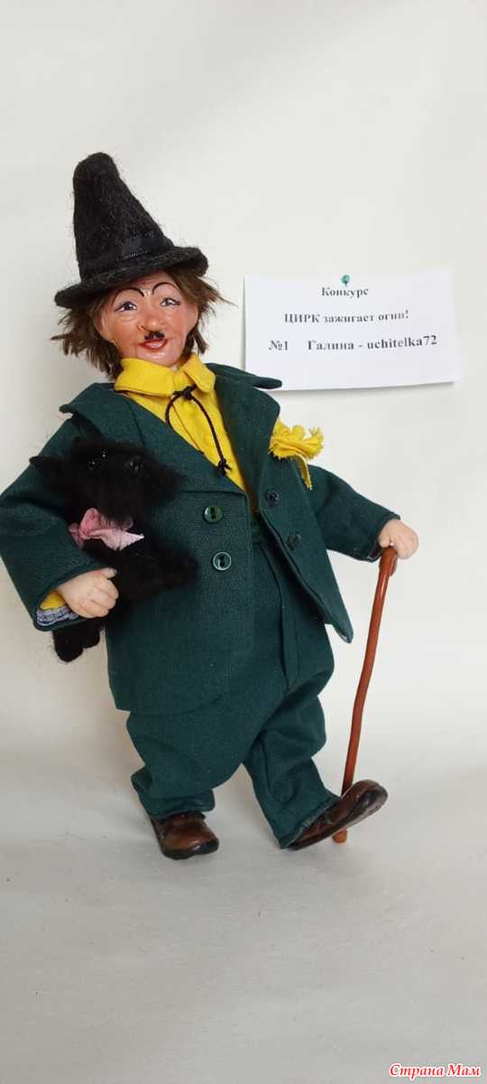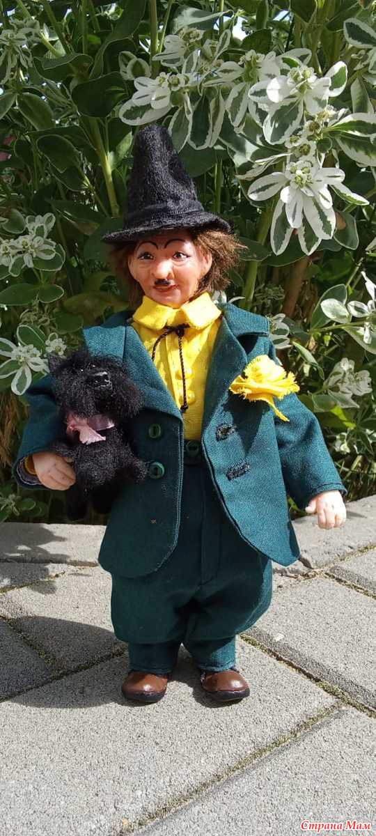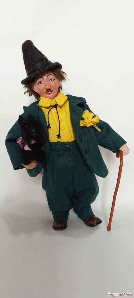 Ещё и тросточка есть у Карандаша.Начинал свою карьеру клоун Румянцев в образе, похожем на образ Чарли Чаплина. Но постепенно придумал свой, тоже узнаваемый с первого взгляда. Мужчины моей семьи сразу назвали правильное имя, взглянув на мою новую куклу. На портретное сходство не претендую (я ж не художник!) Для меня главное было создать узнаваемый образ.