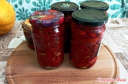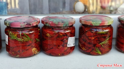 Обязательно тонкими лепестками чеснок (сушит вместе с помидорами), веточка розмарина в каждую баночку. Стоит все в тепле. Хранится долго