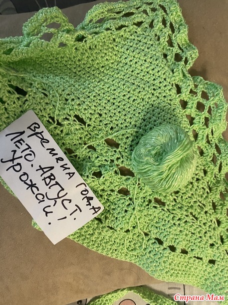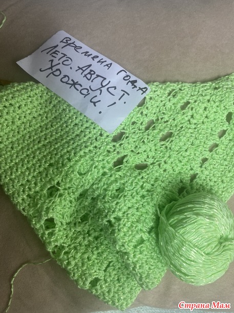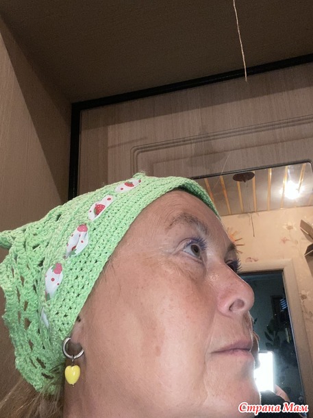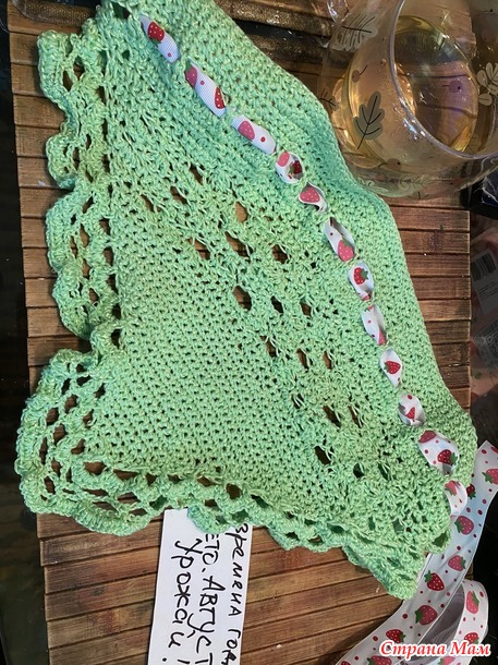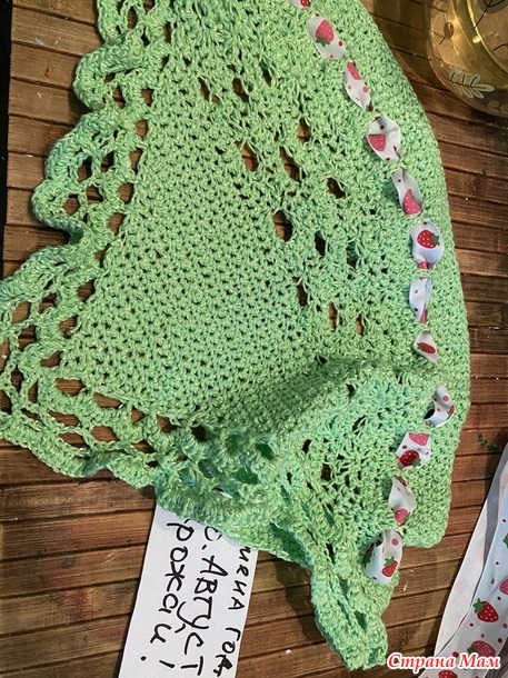 остался от связанного когда-то топа. Как раз нежно-яблочного цвета! И я сразу сделала полосу дырочек, чтобы продернуть репсовую ленту с клубничками.Я так увлеклась фантазийным процессом, что опомнилась лишь тогда, когда косынка почти связалась! Но так как никаких косынок я ни разу не вязала, то я шла от широкой стороны, последовательно убавляя по двум сторонам. Видимо я делала это слишком активно!