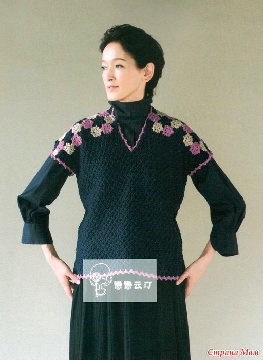 Ажурная безрукавка верх которого оформлен разноцветными цветочными мотивами.