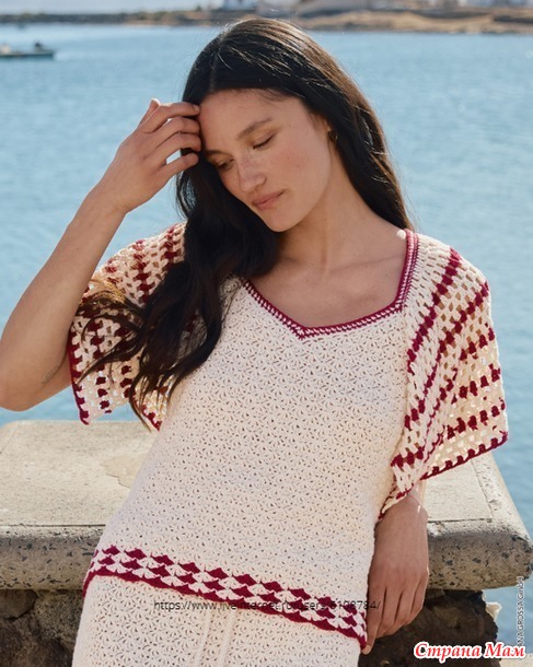 Материал:Lana Grossa «Campo» (65 % хлопок, 25 % вискоза, 10 % лен, LL = ок. 125 м/50 г): ок. 300 (350) г кремового (цв. 2) и ок. 100 г бордового (цв. 26); 1 крючок для вязания № 3,5.