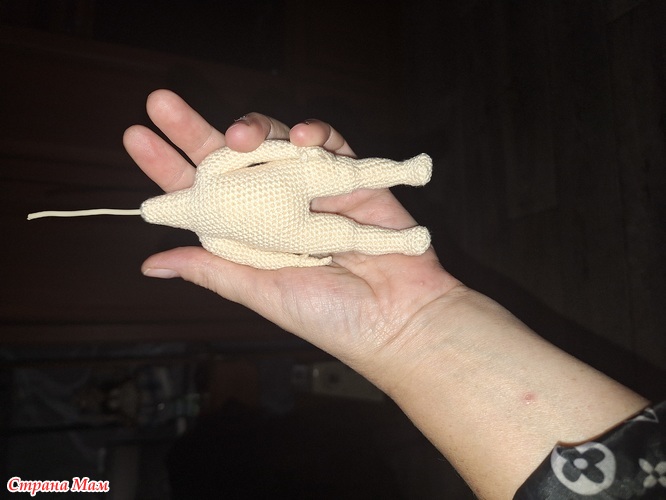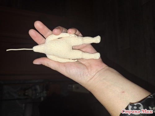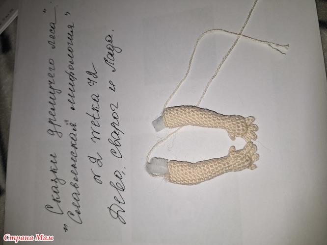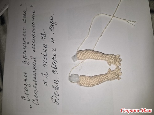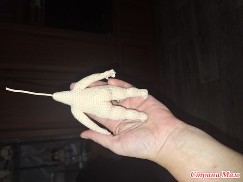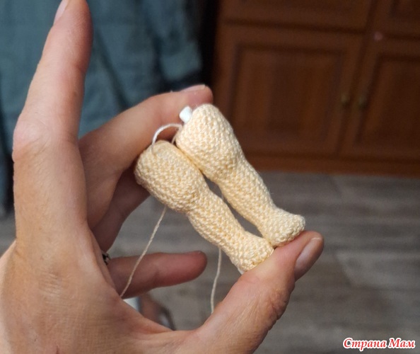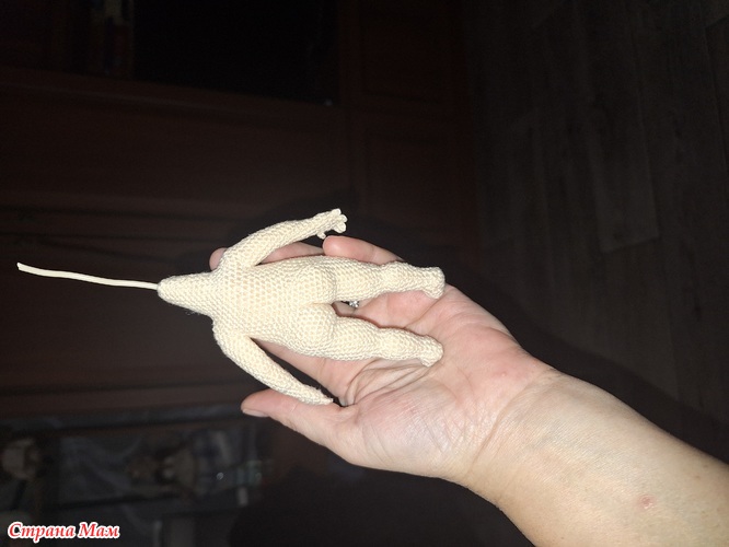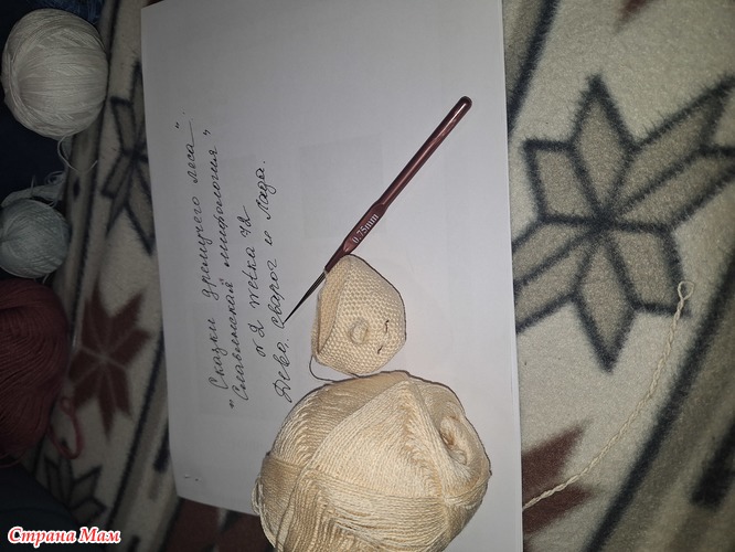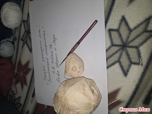 Начинается почему то с головы. Ну да и ладно. Необычно. Дошла до лба и отложила пока в сторонку. Хочу сделать свежепридуманное крепление, которое использовала в предидущем конкурсе впервые. Уж очень мне понравилось что головушка легко и надежно фиксируетя в любом положении. А для этого нужно готовое тело и недовязанная голова. Начала ручки потихоньку.