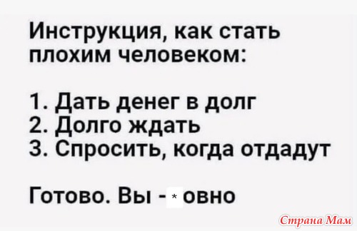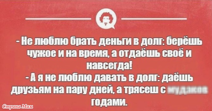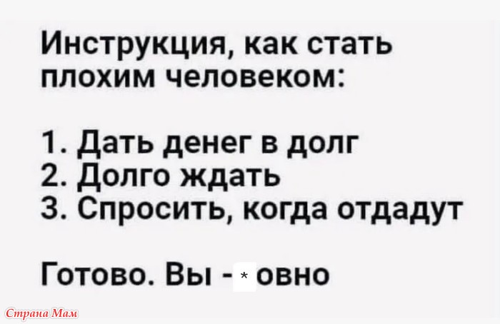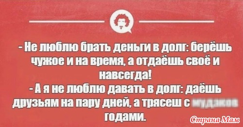Особенно меня поражало "Но ведь у тебя есть деньги и дом ты покупаешь не завтра! Почему не можешь мне одолжить на пару дней?" и я неизменно отвечал, что они у меня потому и есть, что я никому их в долг не даю! Ты же мне по той причине и не отдашь и будешь мне годами говорить "Ты же дом покупаешь не завтра, а у меня сейчас возможности отдать нет!"