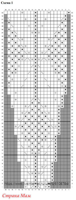 Далее работать по схеме 2, пока глубина кокетки не будет 20 (21, 22, 23, 24, 25, 26, 27, 28) см от начала схемы 1. Закончить четным рядом схемы 2.