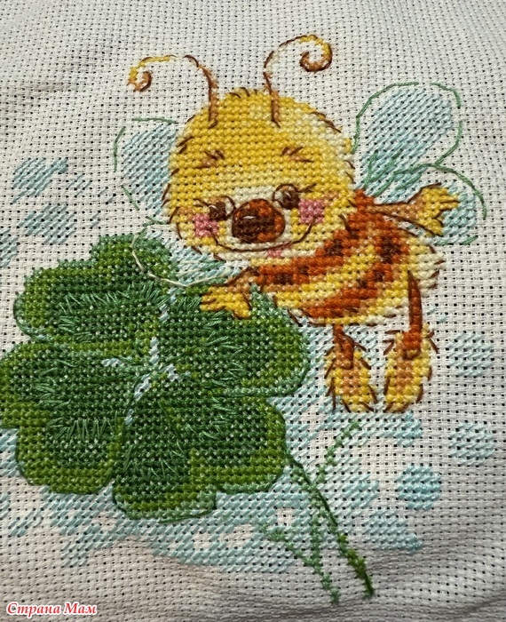 Есть такая примета: нашел клевер с четырьмя листочками - съешь его на удачу. Вышивальщицы клевер не едят, они его вышивают. Для привлечения успеха, удачи и просто хорошего настроения достаточно вышить этот чудесный набор с четырехлистным клевером и очаровательным пчеленком. Очень забавный наборчик. Я когда смотрю на него мне хочется улыбаться. Да и вышивался он очень быстро и легко, не смотря на то что работа выполнялась разными стежками (крест, полукрест, стежокж) и разного качества нитками (шерсть/акрил + мулине ПНК им. Кирова).