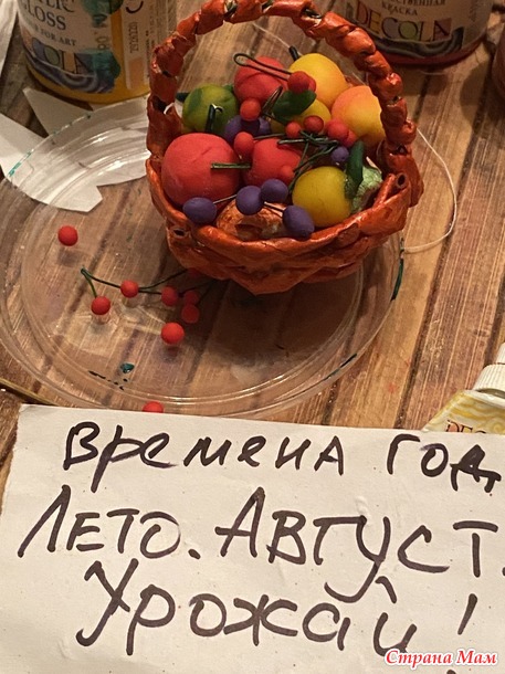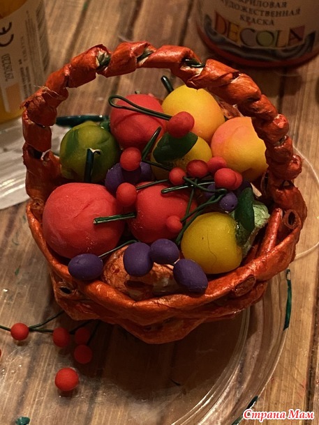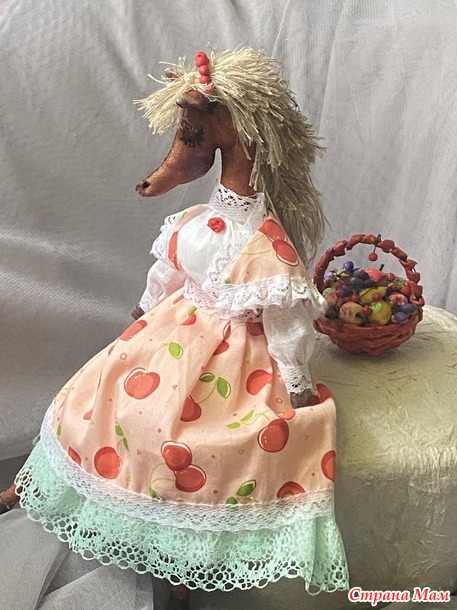 А из Сатина был отшит сарафан, пелеринка и капор-капюшон. Тоже все в кружевах. Из бумажной лозы я быстренько сплела ей корзинку. Из пластишки и флористической проволоки слепила фрукты-ягоды. Все допущенные: яблоки, груши, сливы и вишни. Корзинка вышла яркая и аппетитная!
