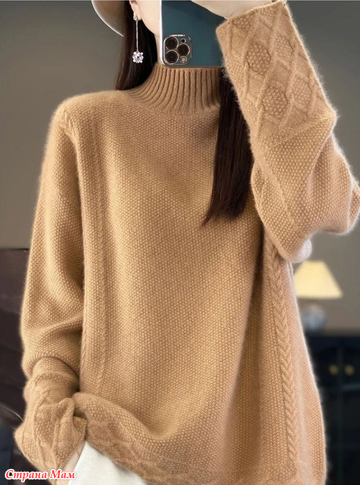 Лаконичная, но очень красивая модель. Основная часть связана мелким жемчужным узором. Акцент сделан на нижнюю часть рукавов, они связаны узором из ромбов. Раппорт - 12 петель и 60 рядов.