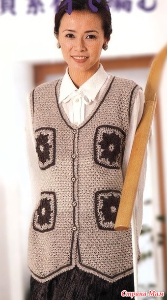 Приталеный жилет с заостренными полочками и вставками по переду из квадратных мотивов. Крючок.