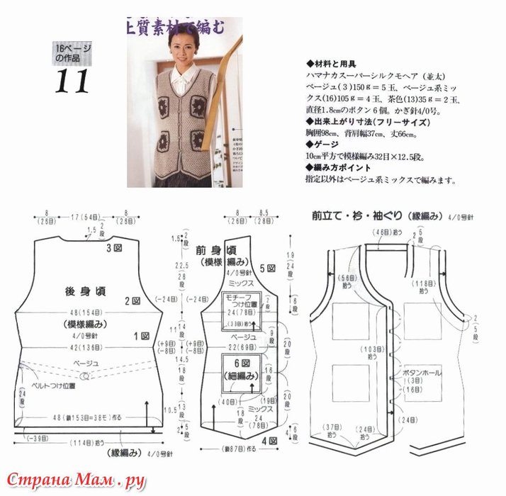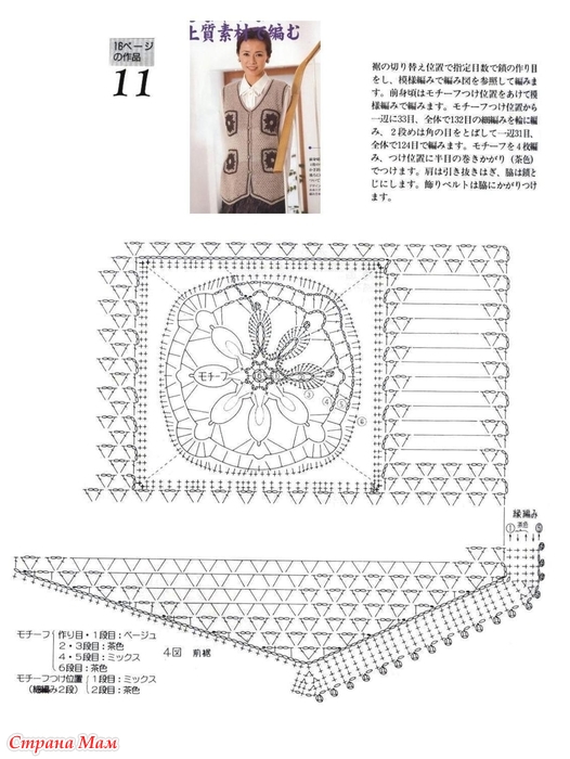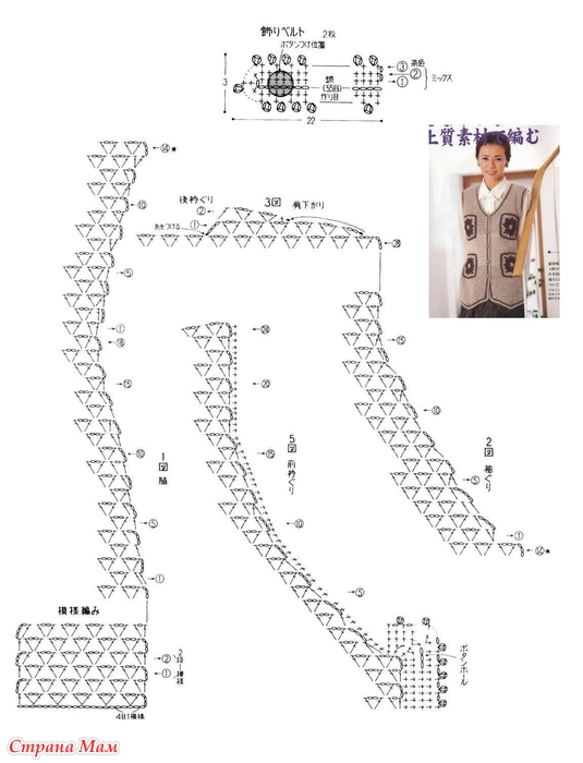 Приталеный жилет с заостренными полочками и вставками по переду из квадратных мотивов. Крючок.