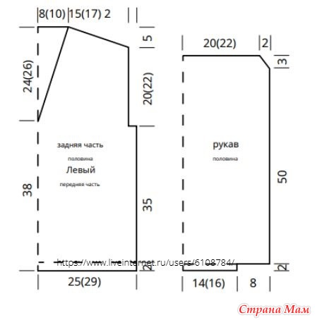 На высоте проймы 20 см закройте по 5 п. три раза и по 4 (4) п. с обеих сторон для скоса плеча. Оставшиеся 21 (25) п. равномерно закройте.