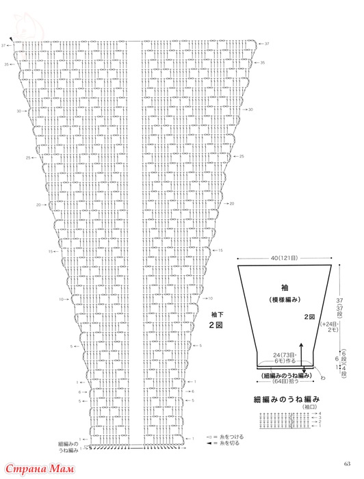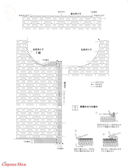 Советы по вязанию Наберите воздушную петлю для тела и рукавов и вяжите узорной гладью. Так как этот узор в основном состоит из столбиков с накидом, убедитесь, что все столбики с накидом одинаковой длины. Обратитесь к рисунку 1 для выреза горловины переда и рисунку 2 для прибавления петель под рукавами. Сверните и обработайте плечи на оверлоке и пришейте рукава к телу воздушным столбиком. Выполните вытягиваемую воздушную петлю по бокам и под рукавами, затем провяжите резинку крючком по кругу на подгибе и столбик без накида по кругу на манжетах. Выполните резинку воротника и планки в указанном порядке и сделайте петлю для пуговицы на правой планке.