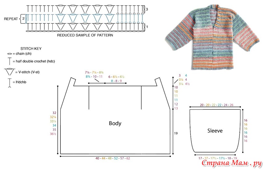 Тело вяжется одной деталью до пройм, затем делится на спинку и перед. Планка также идёт цельновязаная.