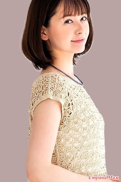 Базовый топ, связанный крючком снизу вверх, с разрезами по бокам, спущенными плечами и вшитыми рукавами.
