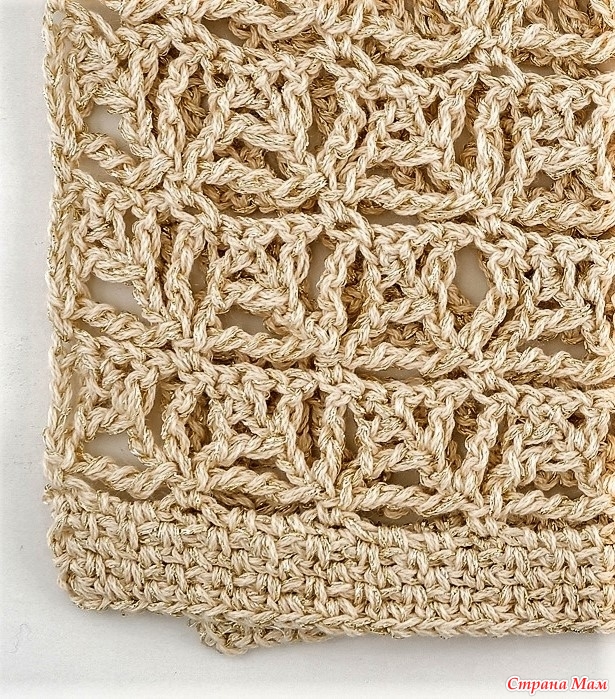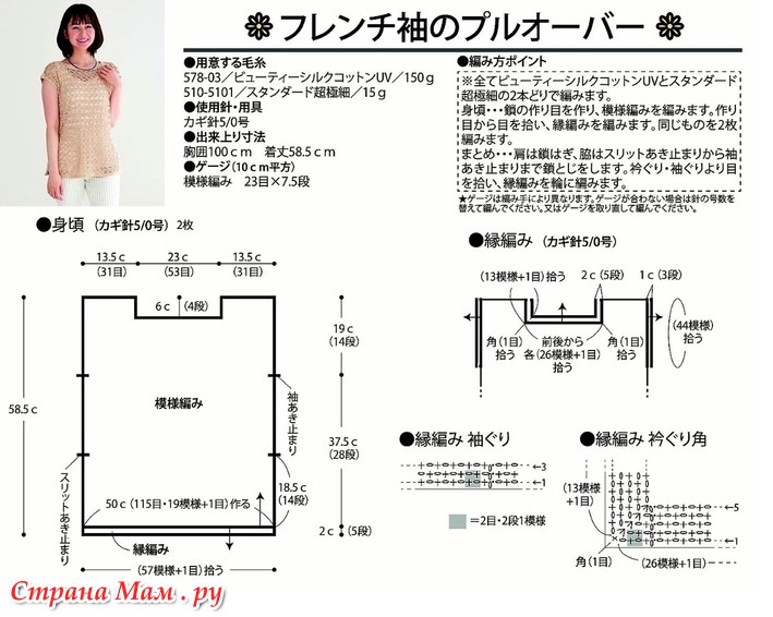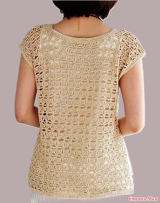 Базовый топ, связанный крючком снизу вверх, с разрезами по бокам, спущенными плечами и вшитыми рукавами.