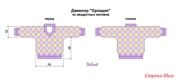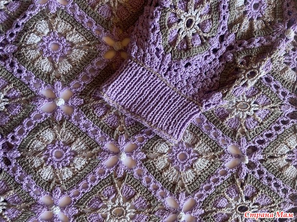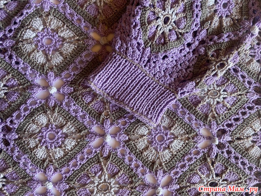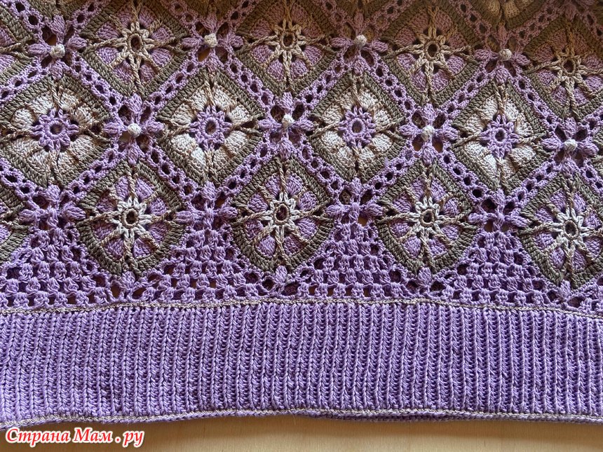 Чтобы не вязать по низу изделия и по низу рукава половинчатые мотивы, связала треугольники из столбиков с тремя накидами провязанные вместе.