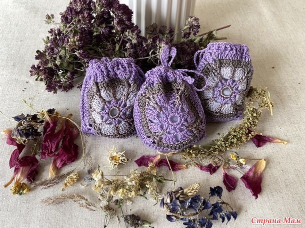 После того как связана кофточка у меня всегда остается много мотивов, так как подбирала схему вязания мотива и сочетания цветов. Связала саше, внутри еще мешочек,( называются пакетики для чая заварочные -7 на 9 см), где находится сушеная травка, для подарков близким.